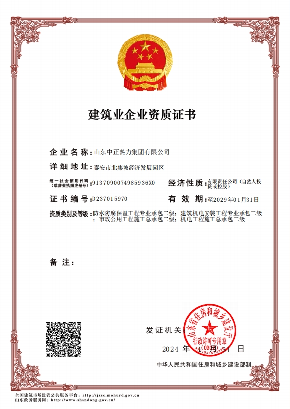 機(jī)電工程施工總承包二級(jí)、市政公用工程施工總承包二級(jí)、建筑機(jī)電安裝工程專業(yè)承包二級(jí)、防水防腐保溫工程專業(yè)承包二級(jí)