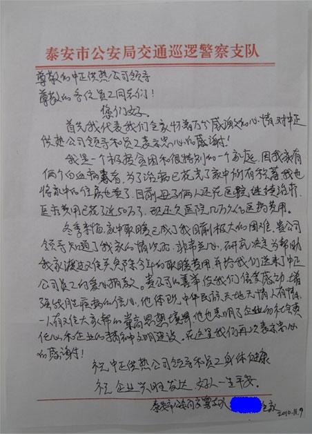 泰安市交警支隊一位家有兩個重病患者的職工深處困境,我公司得知其情況后,免除了該職工家今年冬季的采暖費(fèi),并在全公司進(jìn)行一次獻(xiàn)愛心捐款活動。